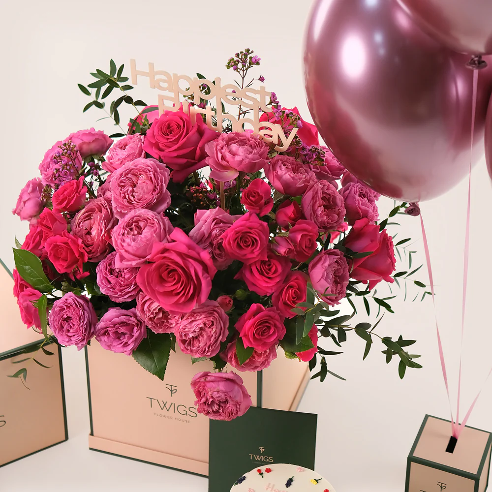 Make their birthday unforgettable with this all-in-one celebration bundle from TWIGS. A vibrant mix of fuchsia premium roses and Juliet cerise roses is artfully arranged in our signature square flower box, available in TWIGS Green or Warm Beige, and topped with a festive “Happiest Birthday” floral topper.