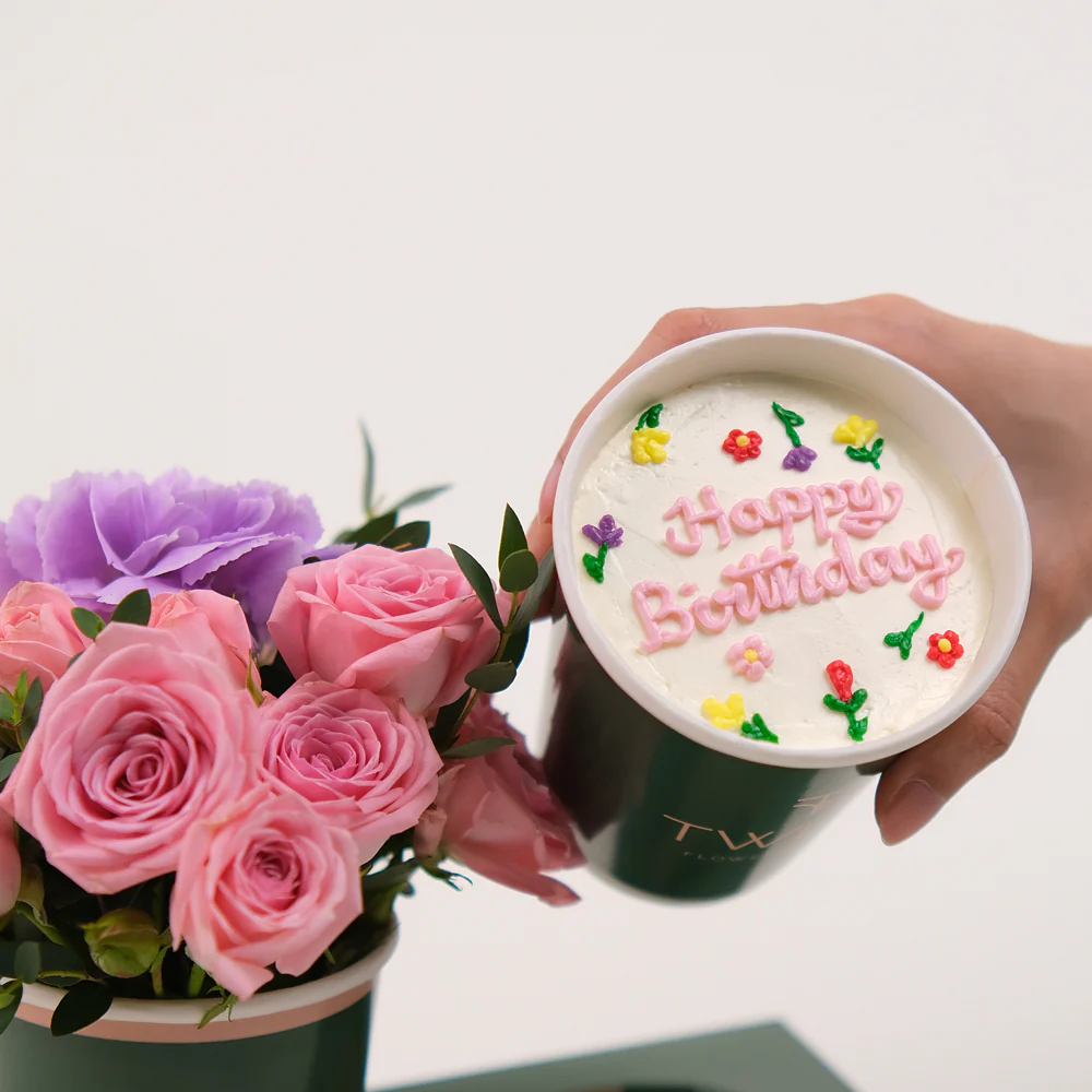 -Paired with a Happy Birthday cake in a cup, crafted for a sweet celebration