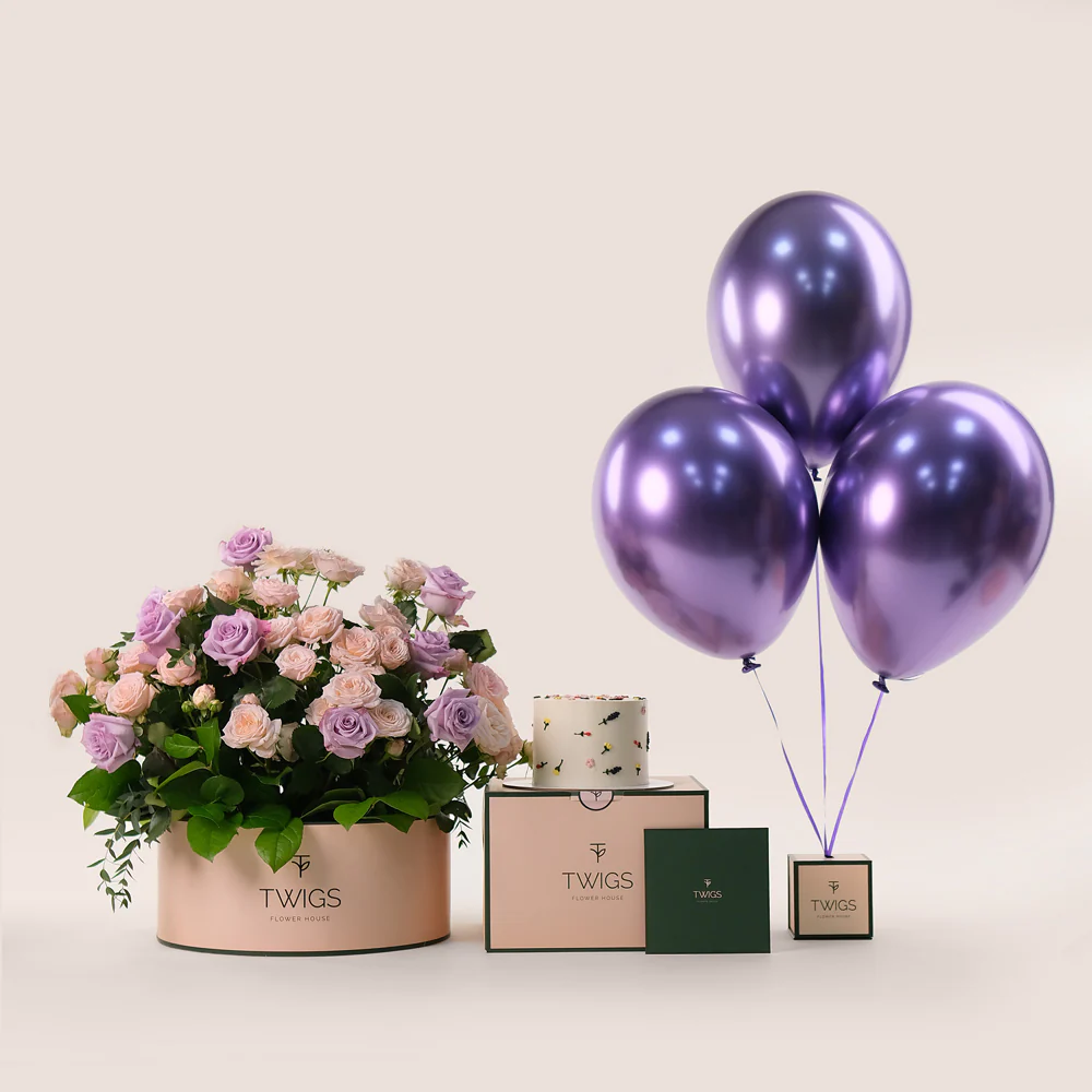 Celebrate birthdays in style with the Birthday Elegance Bundle, featuring an exquisite arrangement of lavender roses and soft pink bombastic spray roses beautifully presented in TWIGS’ signature round box. This luxurious bundle also includes a 1kg Happy Birthday cake, delicately adorned with floral icing, and three vibrant metallic purple balloons, creating a festive and unforgettable gifting experience.