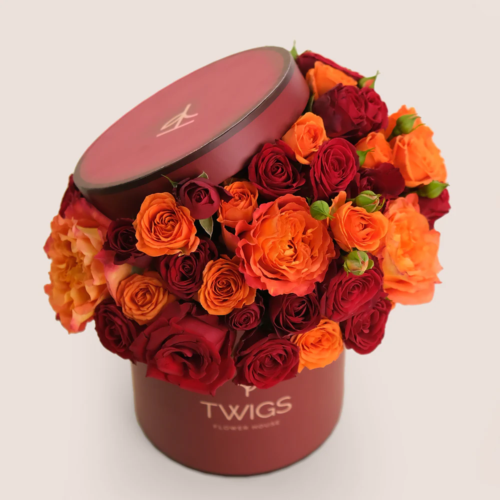 This bold and elegant arrangement features deep Ever Red roses paired with vibrant orange Ecuadorian roses, artfully styled in our burgundy deluxe round flower box. The look is finished with the box lid tilted like a hat, giving it a sculptural, statement-making presence.