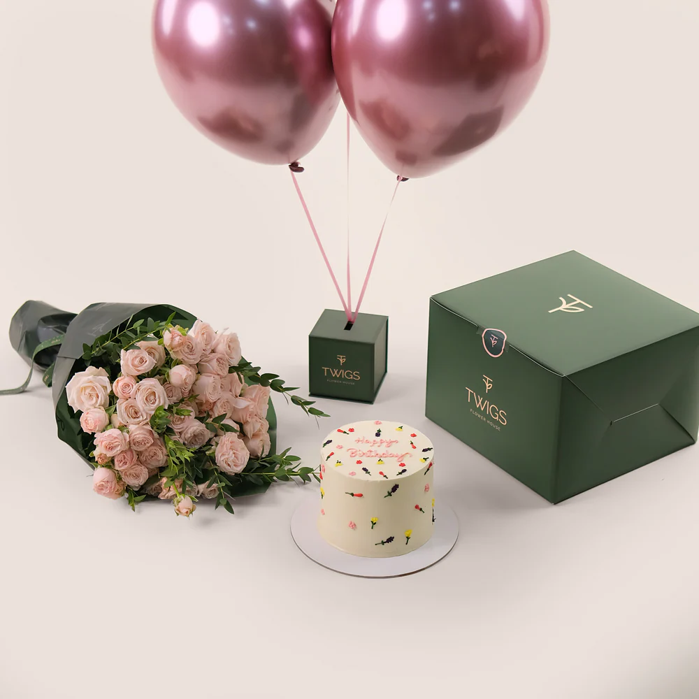 Blush Celebration Bundle – Birthday Flowers, Balloons & Cake - The Perfect Surprise