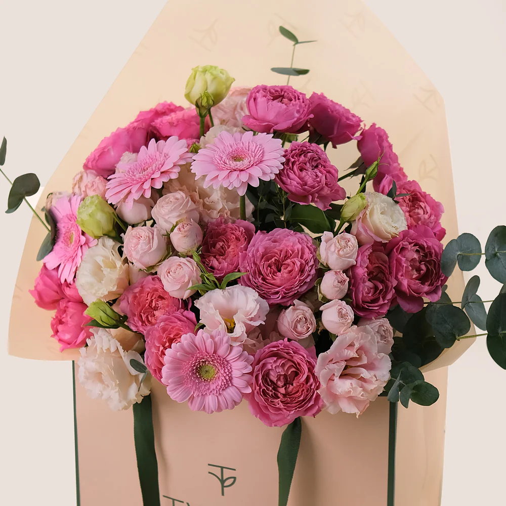 The Blushing Elegance Bouquet Bag is a delightful arrangement of pink gerbera daisies, fuchsia garden roses, light pink spray roses, and cream lisianthus, all beautifully presented in TWIGS’ stylish bouquet bag. This charming and elegant combination is perfect for birthdays, anniversaries, romantic surprises, or any celebration that calls for sophistication and beauty.