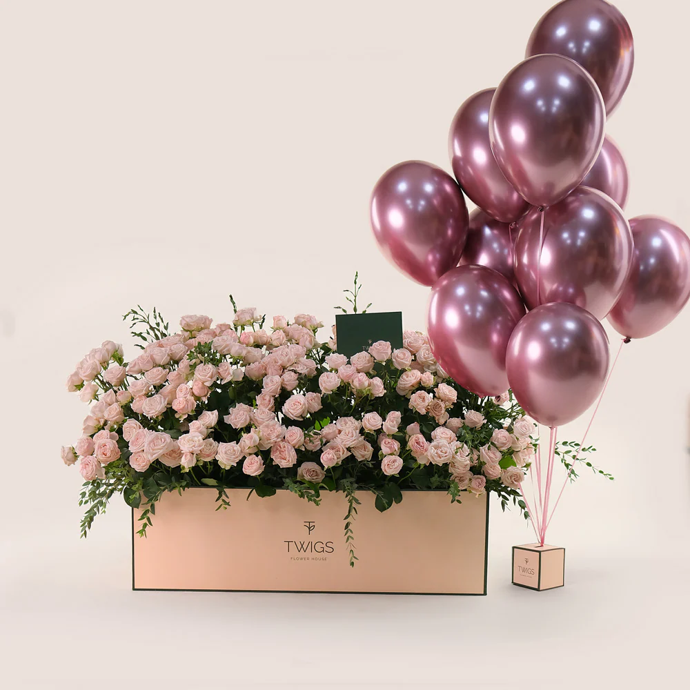 Celebrate life’s sweetest moments with the Blushing Garden Bundle, featuring a generous arrangement of soft pink Bombastic Roses in TWIGS’ premium garden box, paired with 10 metallic pink balloons. This stunning combination is perfect for birthdays, baby showers, or any occasion that calls for a luxurious and festive gift.