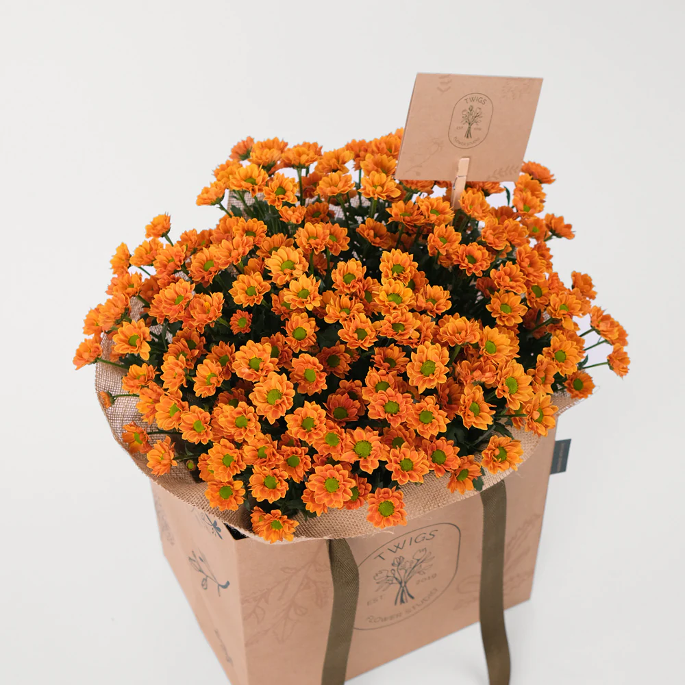 Experience the vibrant burst of our Orange Chrysanthemum Flowers, elegantly presented in our iconic Signature Bag. Each petite chrysanthemum bloom is a testament to nature's zest, ready to infuse your special moments with bright energy. Whether it's a personal indulgence or a heartfelt gift, this bouquet in our signature bag is a lively expression of floral beauty. Order now and let the vivacity of these blooms brighten your day.