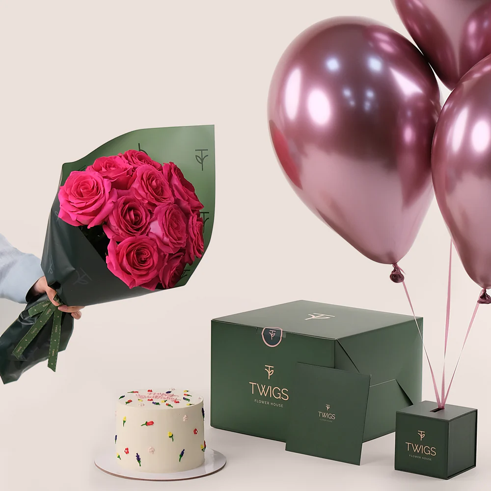 Fuchsia Birthday Bundle – Flowers, Cake & Balloons – A Celebration of Elegance and Joy