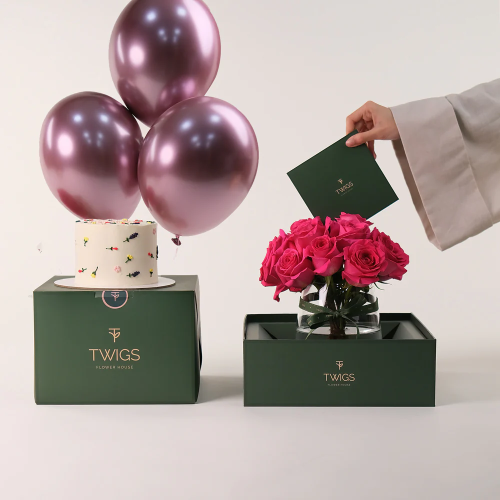 The cake, hailed as the most delicious in Dubai, is adorned with delicate floral icing and a cheerful "Happy Birthday" message. TWIGS’ petite vase, delivered in a chic vase carrier box, adds a sophisticated touch, while the vibrant pink balloons bring festivity to the occasion. With the easiest online ordering and fast delivery, this bundle is a seamless and thoughtful way to gift elegance and joy.