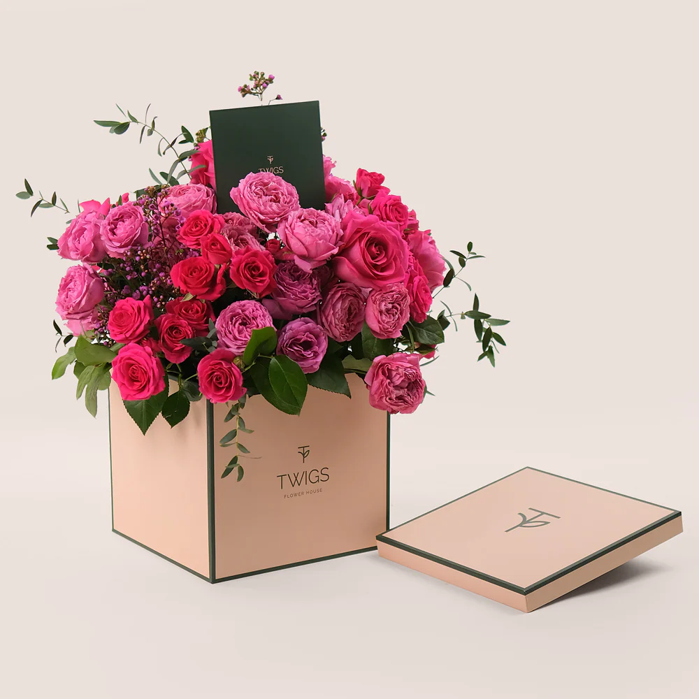Presented in a stylish square box, this bouquet combines the beauty of freshly sourced roses with a modern and refined look. With its bold and graceful mix of fuchsia and pink, it will brighten any room and make any occasion feel extraordinary.