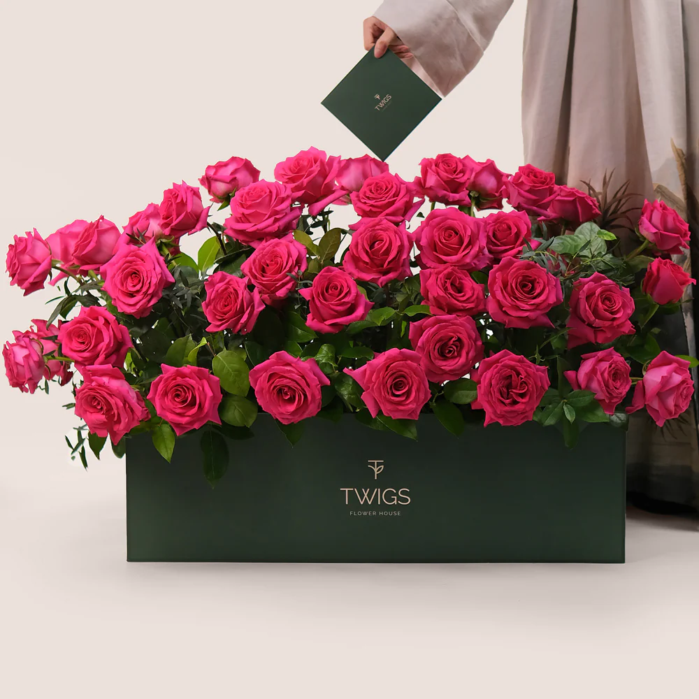 Share the beauty of a flower garden with Hot Pink Ecuador Roses arranged in TWIGS signature Garden Box. Styled like a blooming flower bed, this open box design showcases each vibrant rose alongside lush greenery, creating a stunning, natural display. Ideal for celebrations, romantic gestures, or any occasion where you want to make a lasting impression, this arrangement brings the freshness of a garden into any space.