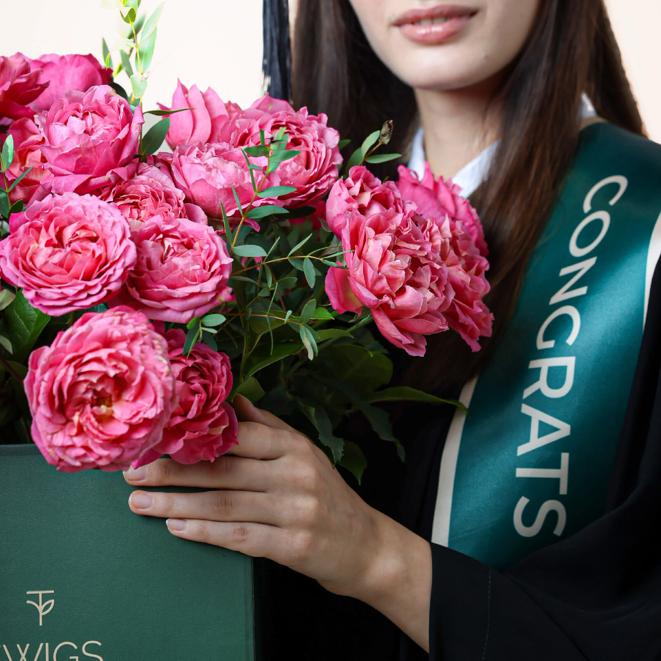 This chic duo includes a premium pink flower arrangement in our square signature box and the standout “CONGRATS TO ME / JUST GRADUATED” satin sash in deep green and beige — the ultimate power pairing for grads who deserve to be celebrated loudly (and beautifully).