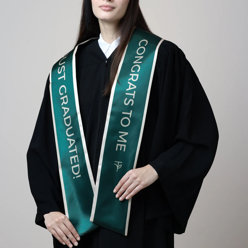 Crafted in deep green satin with elegant beige edging, this sash features bold English phrases on each side — “JUST GRADUATED!” and “CONGRATS TO ME” — to mark the occasion with attitude and style.