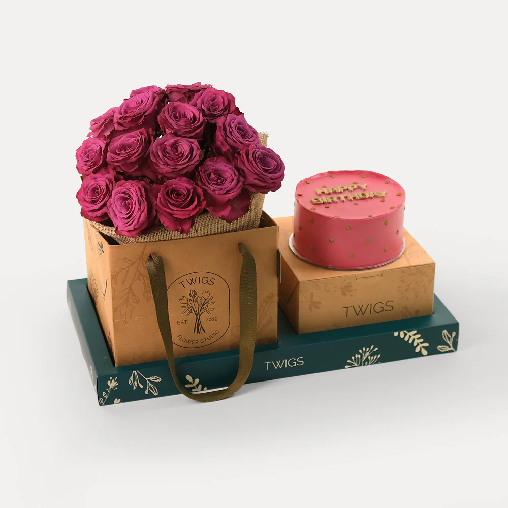 Celebrate a birthday in style with our Happy Birthday Flowers and Cake Tray combo. This charming combination features a stunning bouquet in a pink color scheme, perfectly complemented by a delicious cake. It's the perfect way to make someone's special day even more memorable.