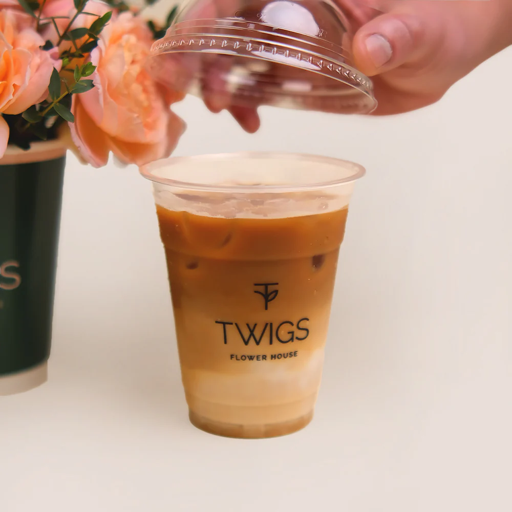One of our most loved concepts, reimagined — this coffee and flower combo pairs a refreshing iced Spanish latte with soft and delicate Juliet peach roses, all styled in a chic TWIGS takeaway cup.