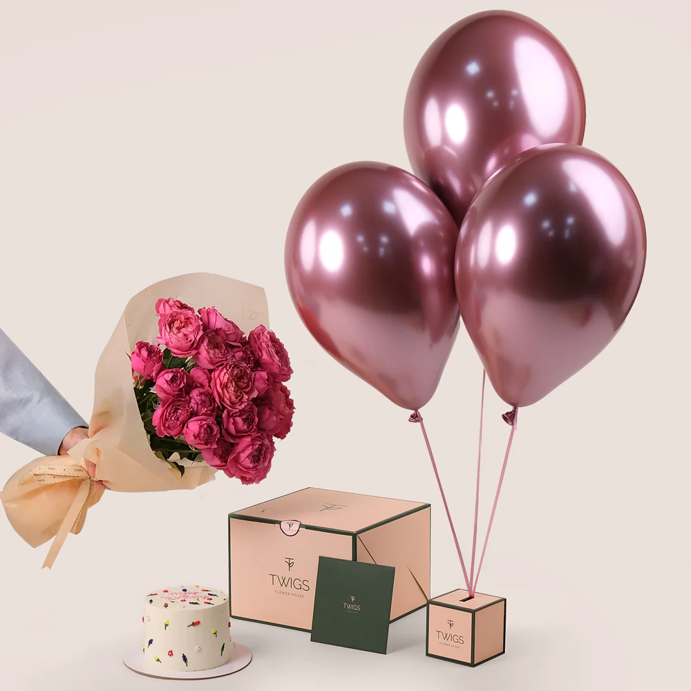 Celebrate life’s special moments with the Juliet Cerise Birthday Bundle, featuring a vibrant bouquet of Juliet Cerise roses, hand-tied and elegantly presented in TWIGS’ signature cone-shaped bunch bag. This striking arrangement is paired with our 1kg floral Happy Birthday chocolate cake, renowned as the most delicious cake in Dubai, and three chrome fuchsia balloons secured with TWIGS’ signature balloon holder.