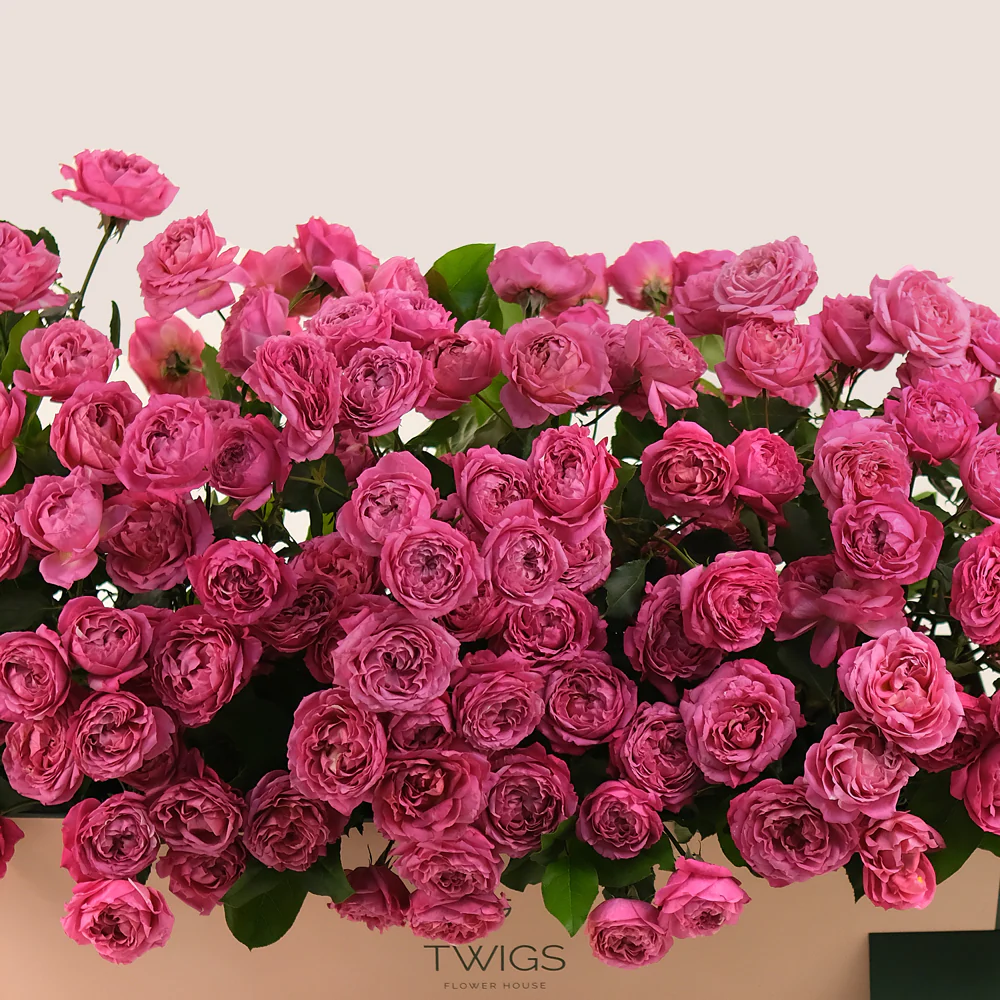 - Stunning Juliet cerise flowers arranged in TWIGS Premium Garden Box