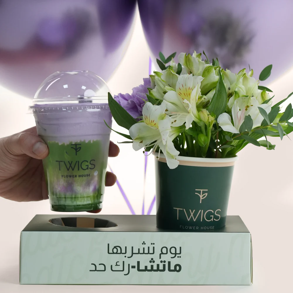 A flower cup arrangement of white and green alstroemerias with a delicate light purple carnation, styled to perfectly match our iced lavender matcha drink.