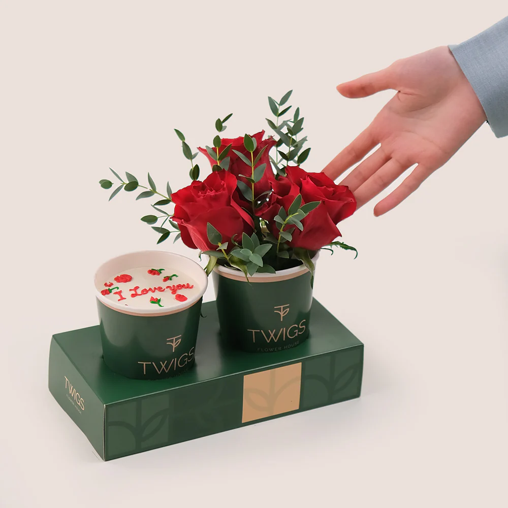 Express your love with the Love in Bloom Gift Tray, featuring three stunning red roses arranged in a charming flower cup, paired with the most delicious cake in Dubai, adorned with the heartfelt message "I Love You". Delivered in a stylish combo tray, this thoughtful gift is perfect for romantic gestures, anniversaries, or special surprises.