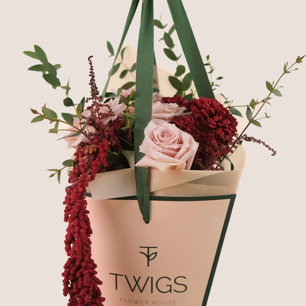 Manar’s Choice – Burgundy & Neutral Flowers Hand Bouquet in TWIGS Cone Bag