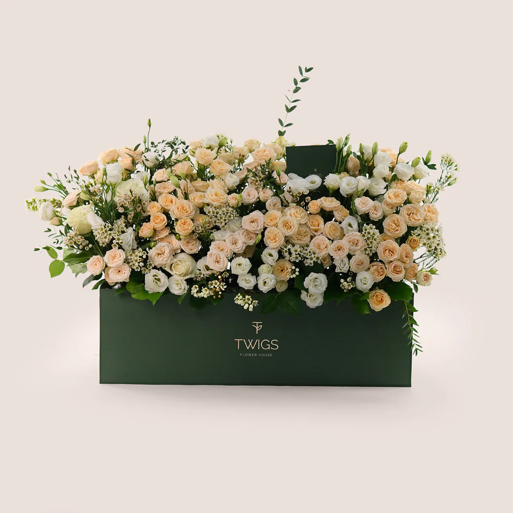 Step into a world of soft, timeless beauty with our Light-Colored Floral Mix arranged in TWIGS' signature Garden Box. This serene blend features Wasabi Roses, White Lisianthus, Salinero Spray Roses, and delicate White Wax Flowers. Styled like a blooming flower bed, this arrangement captures the essence of nature in a refined, elegant display. Ideal for birthdays, get well soon wishes, or heartfelt gestures, this Garden Box brings a piece of the outdoors inside.