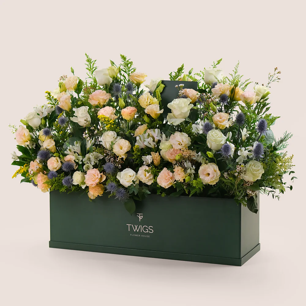 The Pastel Harmony Garden Box is a graceful arrangement of pastel lisianthus, white alstroemerias, white roses, eryngiums, delicate wax flowers, and golden solidago, beautifully arranged in TWIGS’ Premium Garden Box. This refined bouquet is perfect for housewarmings, anniversaries, birthdays, or as a thoughtful gift to brighten someone’s day.