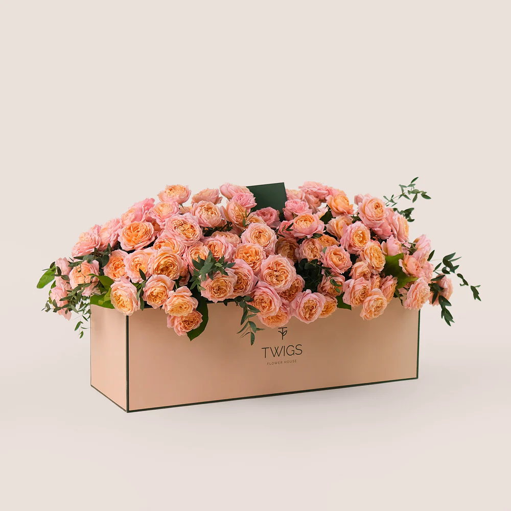 - Soft peach Juliet roses arranged in TWIGS’ signature garden box