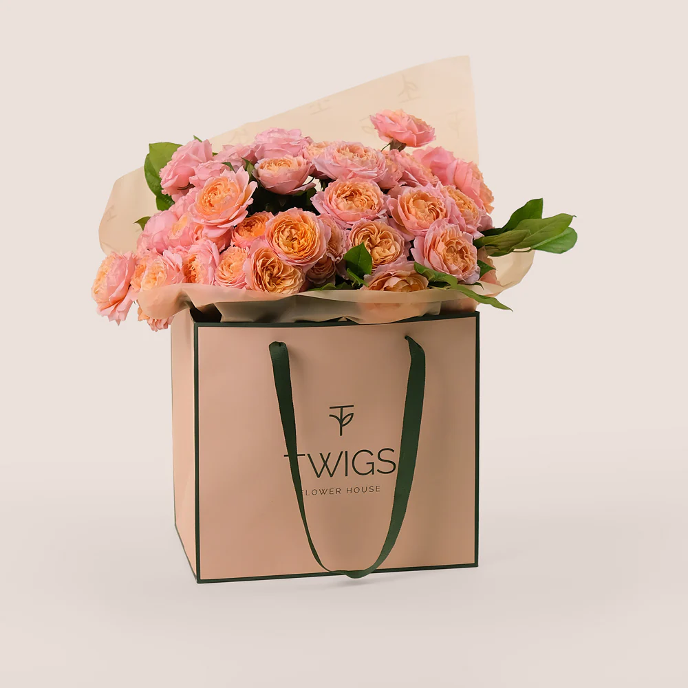 Peach Juliet Spray Roses Hand-Tied Bouquet – Soft Elegance in a Chic TWIGS Flower Bag