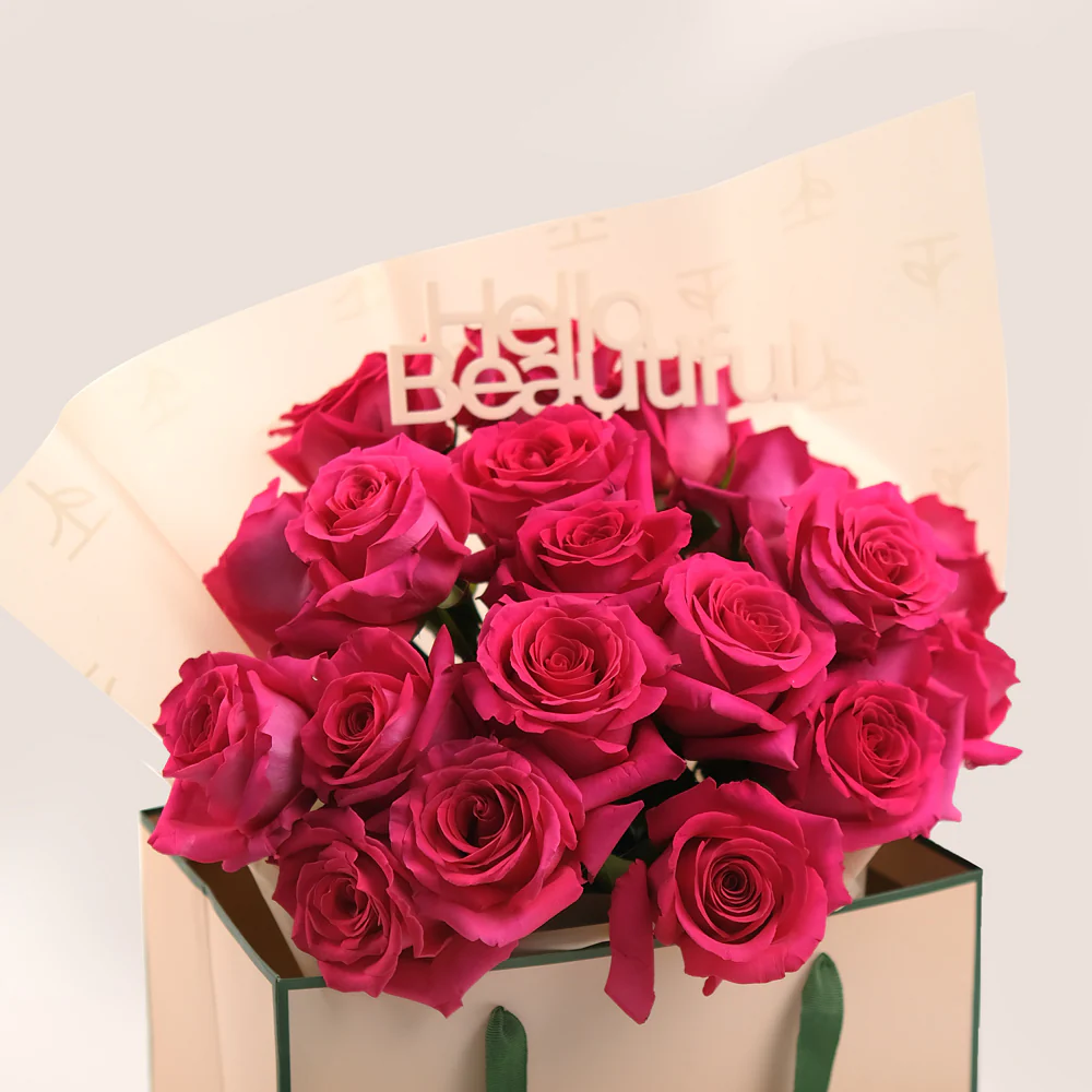 Brighten someone’s day with the Pink Floyd Roses Hand Bouquet, featuring fuchsia Ecuador roses renowned for their vibrant color and lush blooms. This exquisite arrangement is delivered in TWIGS’ signature gift bag and adorned with a charming "Hello Beautiful" message topper, making it the perfect gift for birthdays, romantic surprises, or heartfelt gestures.