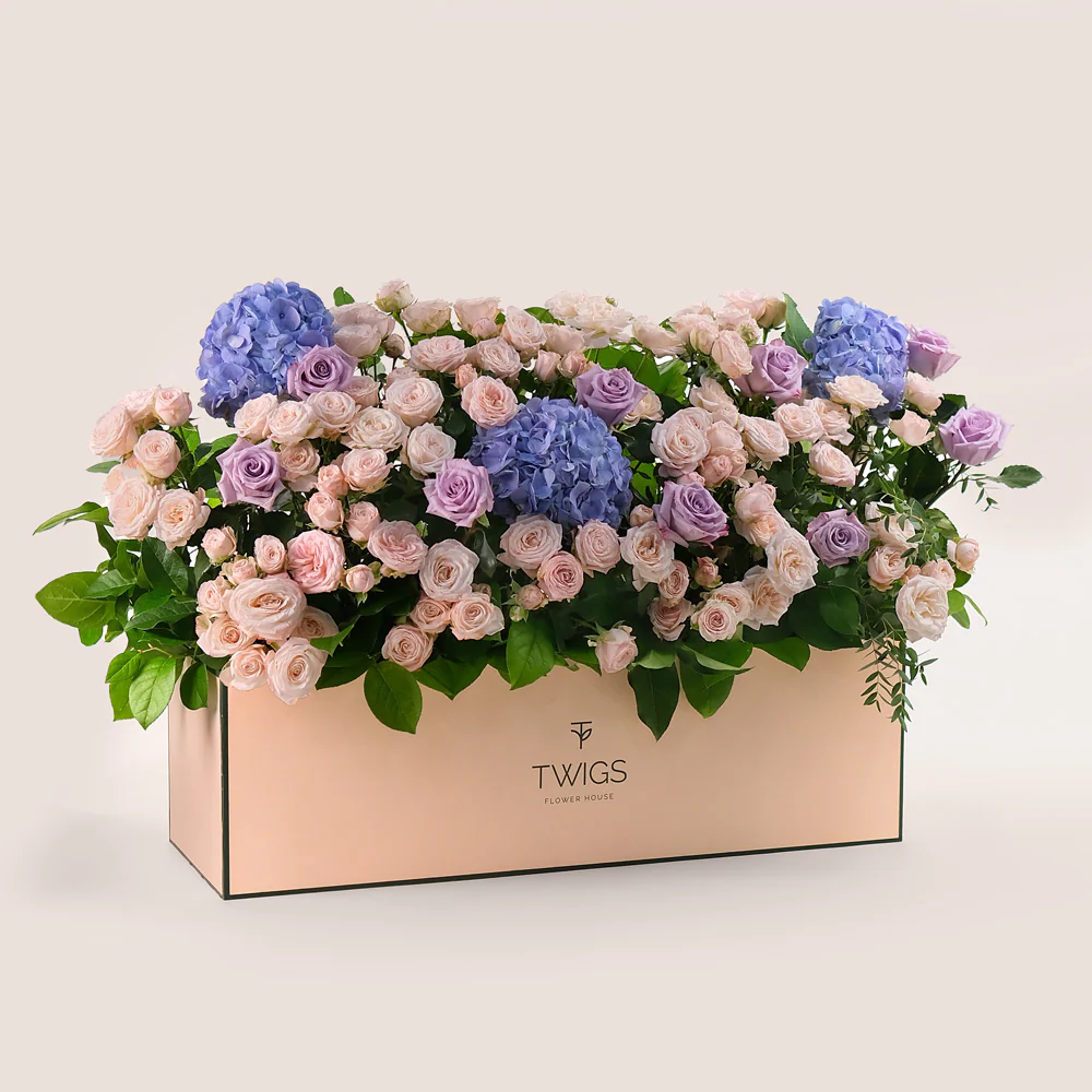 Premium Flowers in a Garden Box – A Lush Display of Purple Hydrangeas, Lavender Roses & Bombastic Blooms