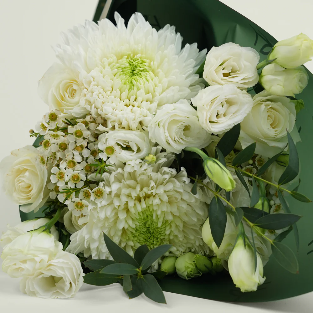 Timeless, pure and beautifully refined — the Pure Bloom Bunch is created for those who love classic, serene, and elegant gifting. Featuring a curated mix of white roses, white lisianthus, white deco chrysanthemums, and white wax flowers, this bouquet delivers a soft, graceful palette suitable for every meaningful moment.
