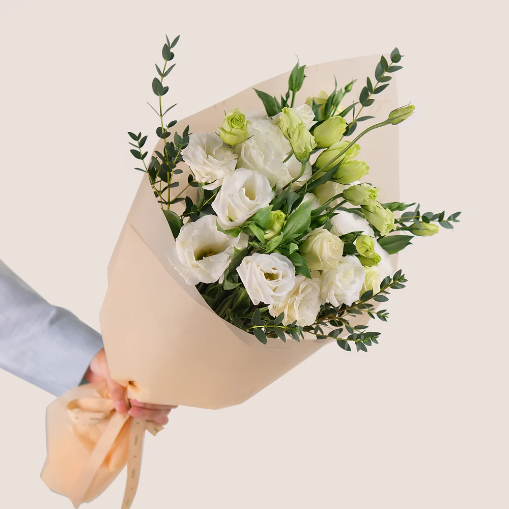 Pure Grace – Lisianthus & Eucalyptus Cone Bouquet – A Timeless Bouquet of Simplicity and Elegance
