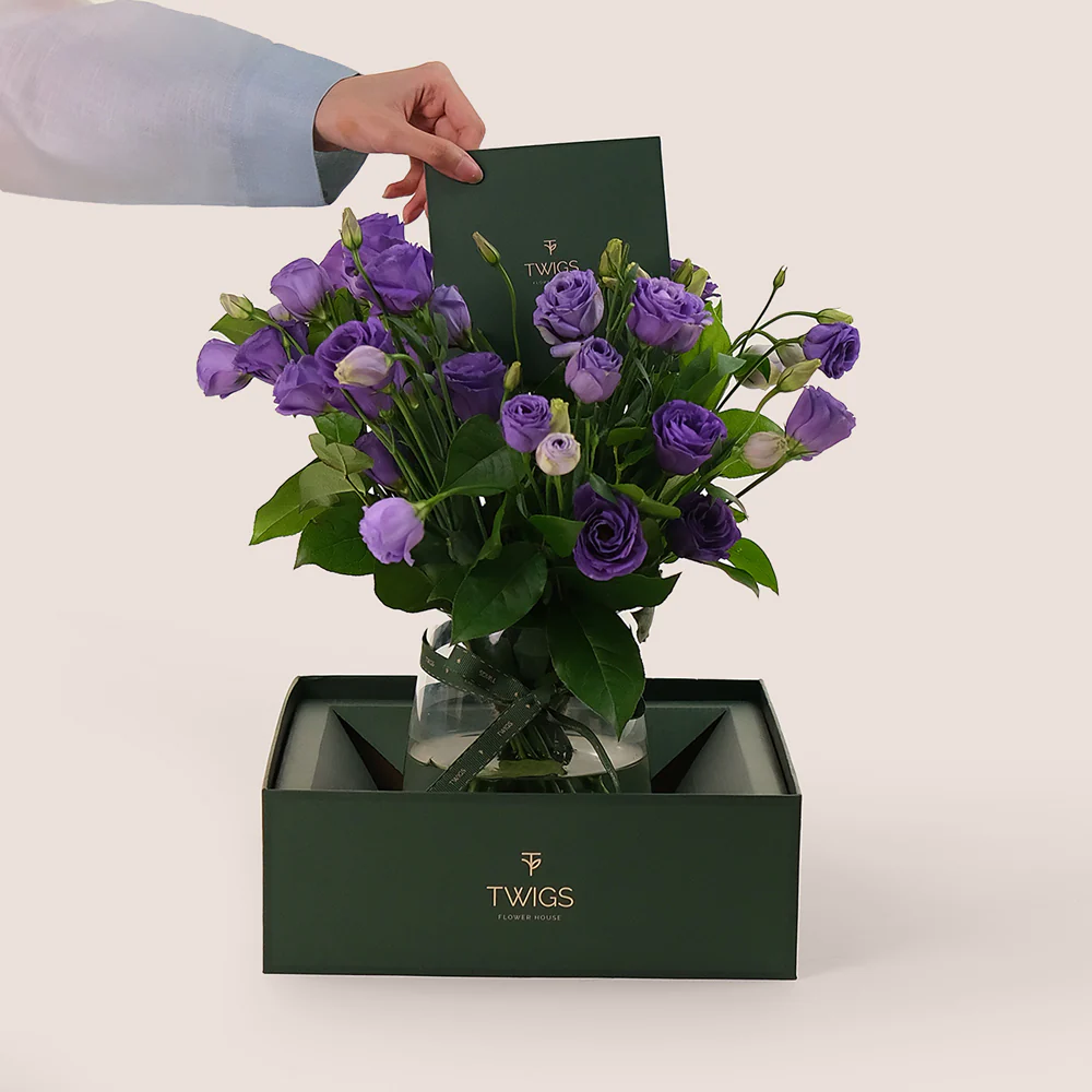 With freshly sourced blooms, the purple lisianthus flowers create a striking yet understated display, making it the perfect addition to any room. Delivered with fast, same-day delivery in Dubai and UAE, the Purple Charm Bouquet offers a seamless and delightful gifting experience.