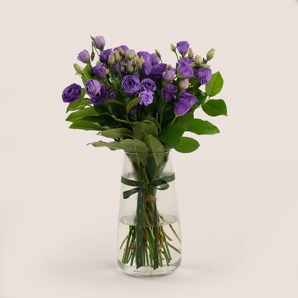 The Purple Elegance Bouquet features a stunning glass vase filled with luxurious purple lisianthus flowers, known for their delicate petals and sophisticated color. This exquisite arrangement is perfect for birthdays, anniversaries, or any occasion that calls for a touch of elegance and charm.