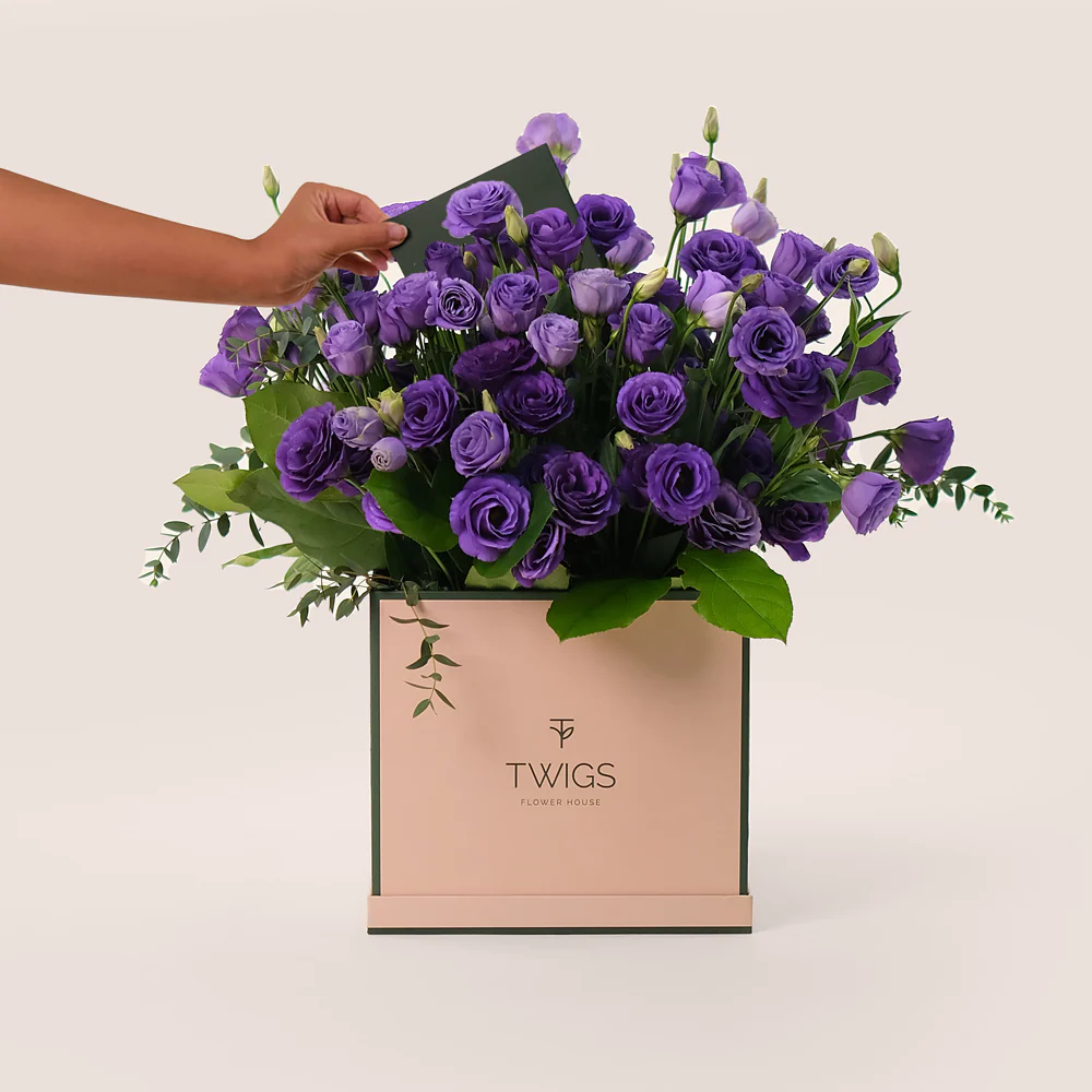 Delivered in a modern square box, this bouquet showcases the graceful beauty of purple lisianthus in a chic and contemporary way. With freshly sourced blooms, it is guaranteed to make a lasting impression with its rich color and delicate petals.