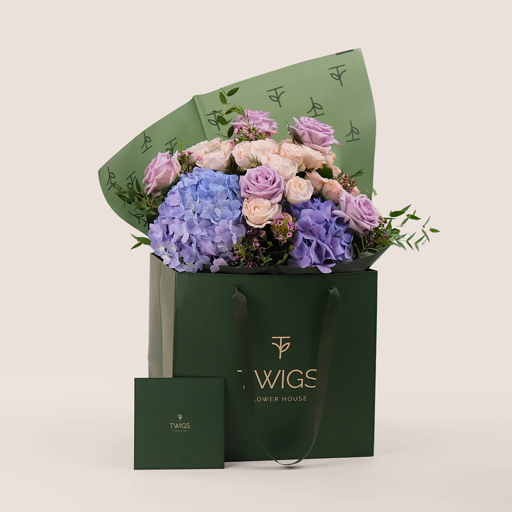 Purple Hydrangea & Rose Hand Bouquet – Soft Elegance in a Chic Flower Gift Bag