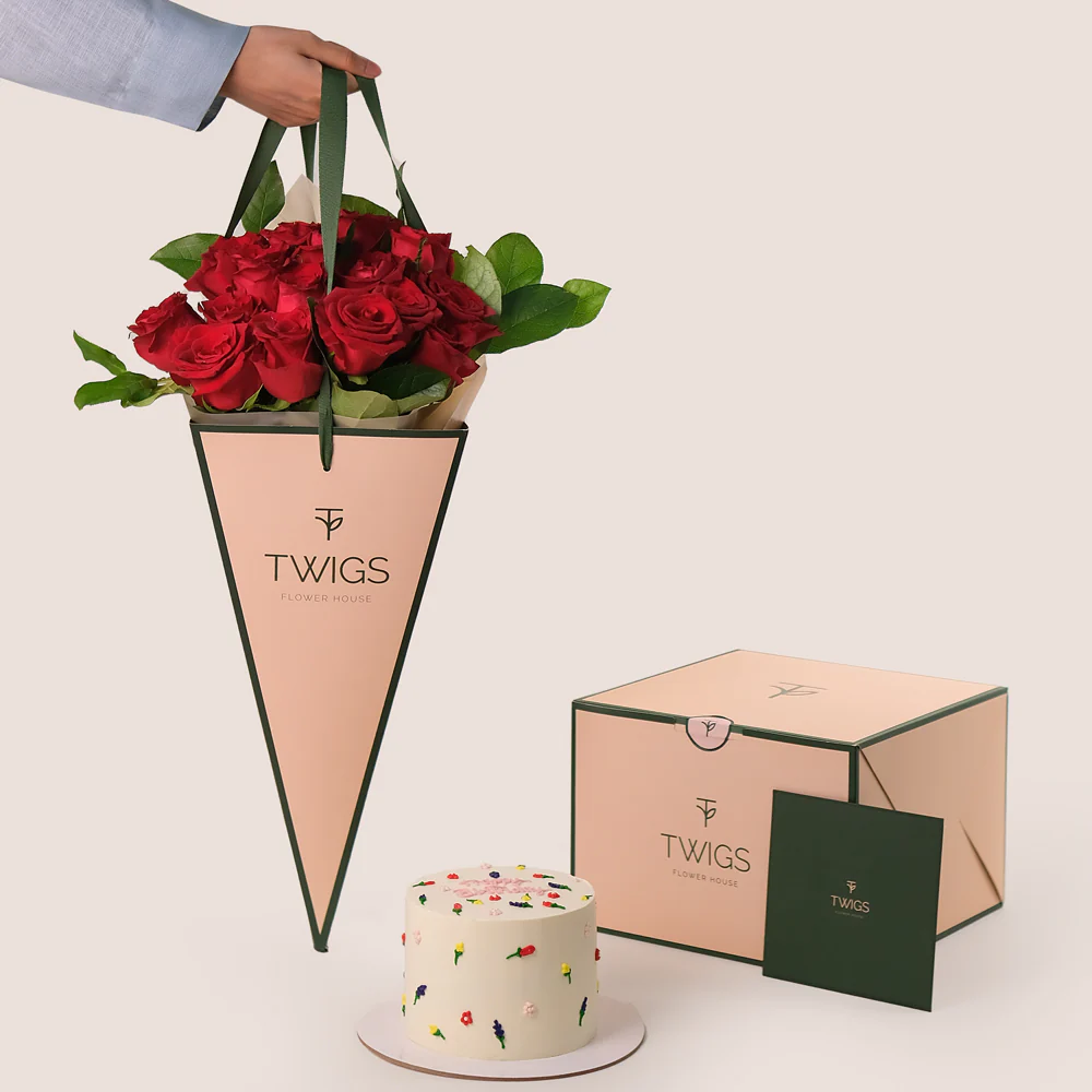 The Red Roses Birthday Bundle combines timeless beauty and indulgent delight. Featuring a hand-tied bouquet of premium red roses, elegantly presented in TWIGS’ signature cone-shaped bunch bag, this bundle is paired with our 1kg floral Happy Birthday chocolate cake, known as the most delicious cake in Dubai.