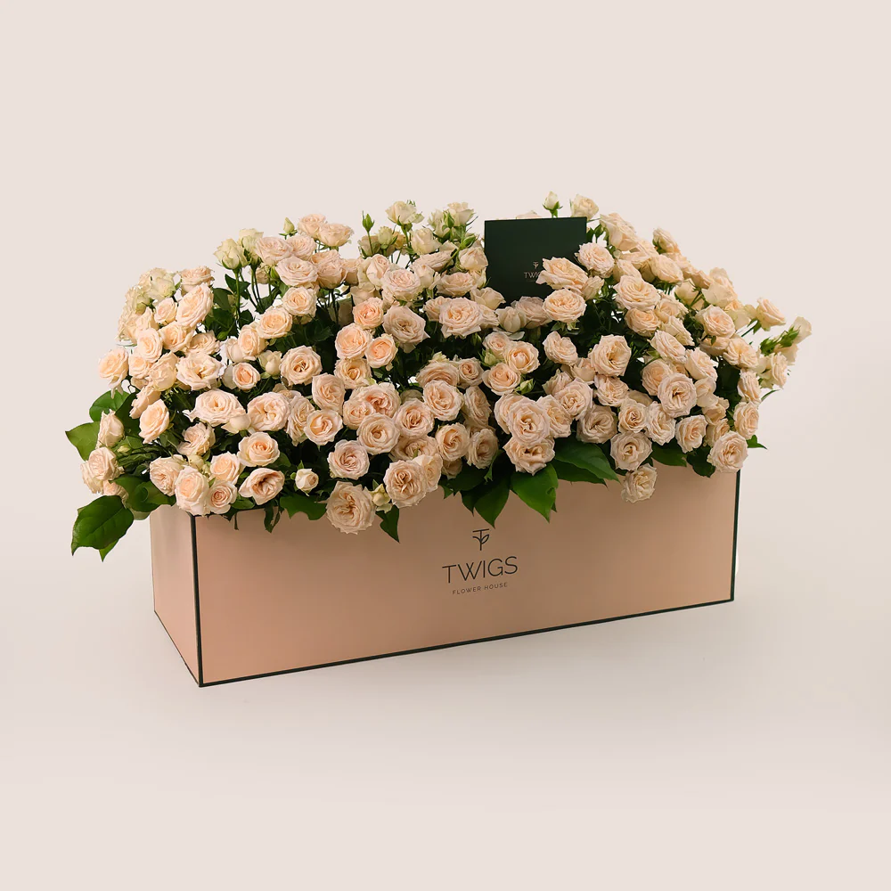 - Generous arrangement of cream Salinero spray roses in TWIGS’ luxurious garden box