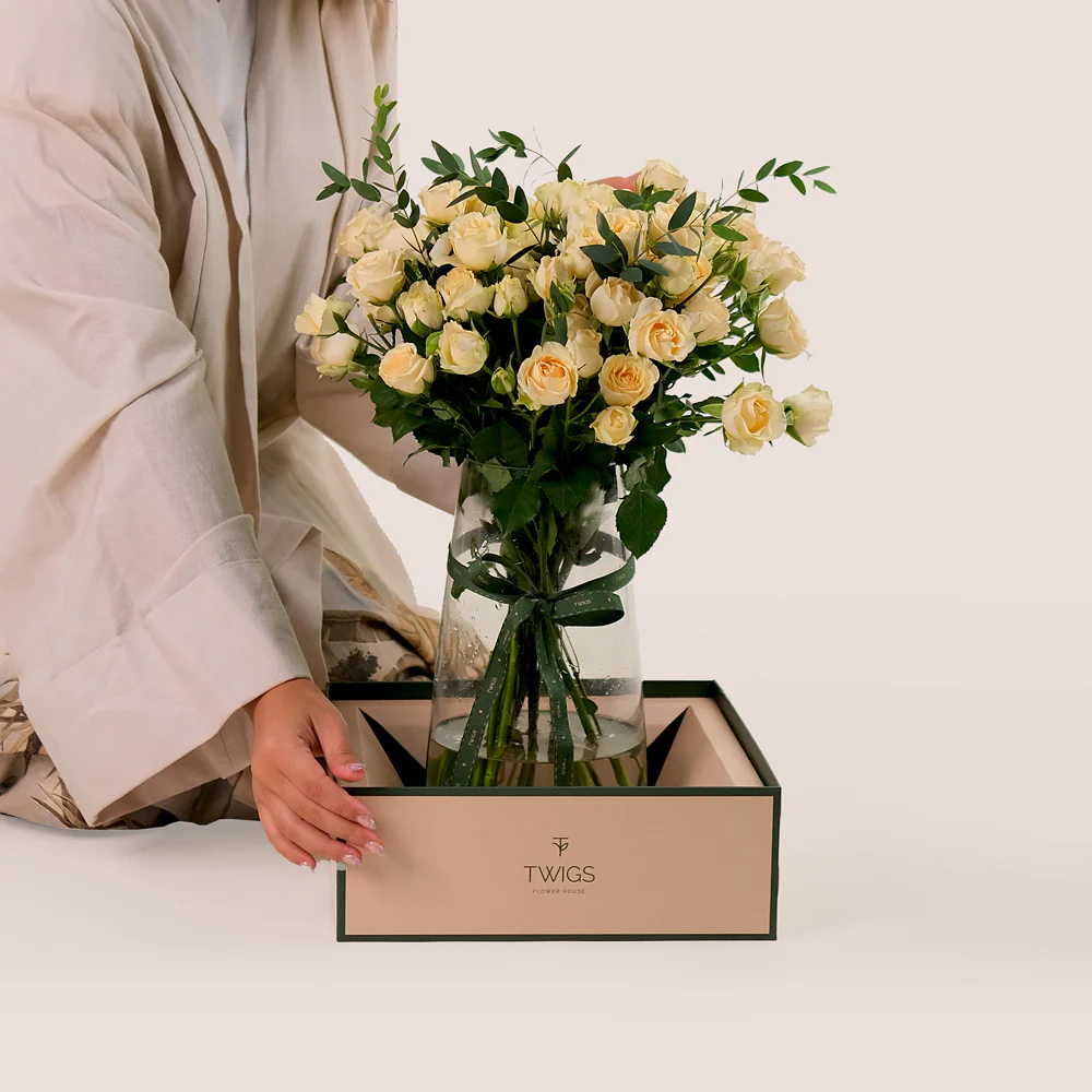 Soft Cream Salinero Roses in Flower Vase – A Dreamy and Elegant Floral Display