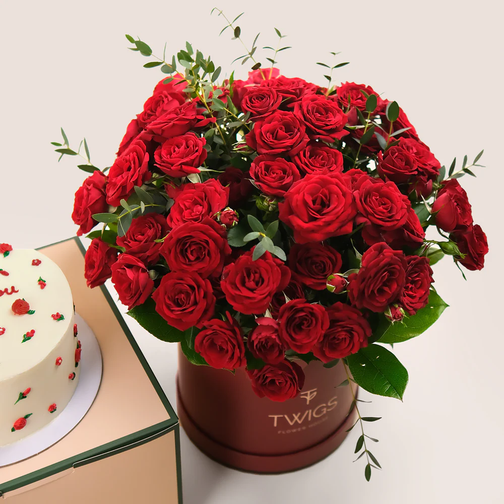 This luxurious bundle features premium red roses, beautifully arranged in our Limited Edition Burgundy Round Flower BoxĀ and a 1kg handcrafted floral Valentineās cake with a romantic āLove Messengerā design.