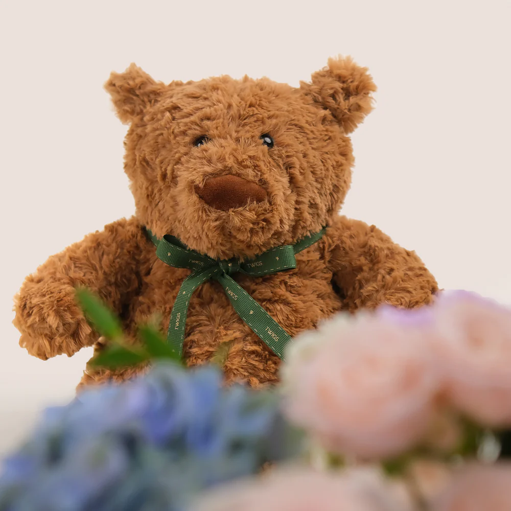 Plush Teddy Bear – A soft and cuddly keepsake that complements the floral beauty, making this bundle even more heartfelt and memorable.