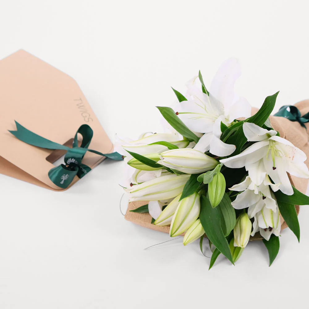 Get ready to embrace some natural charm with our White Lily Flowers Bunch. These white lilies are all about pure, easy elegance, ready to liven up your space with their laid-back beauty. Whether you're treating yourself or sharing the love with someone special, this bunch is a relaxed expression of floral finesse. Grab yours now and let the White Lily Flowers add a touch of casual beauty to your day!