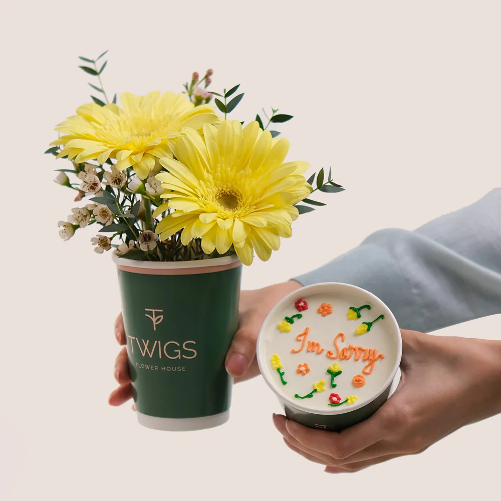 A sincere gesture to soften the heart — this TWIGS mini combo is designed to say “I’m Sorry” in the sweetest way. Featuring bright yellow gerbera flowers in a takeaway cup, paired with a cake in a cup adorned with an icing message that reads “I’m Sorry.”